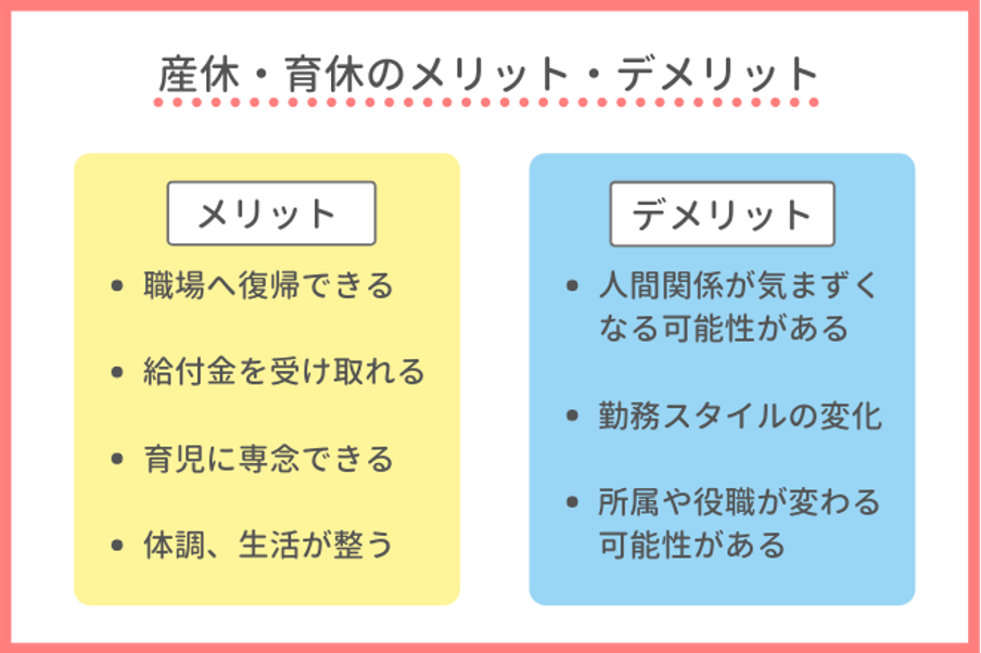 産休・育休はぜひとも利用していただきたい制度ですが、メリットだけでなく人によってはデメリットもあります。