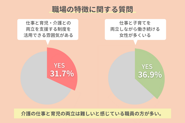令和3年度の介護労働実態調査「介護労働者の就業形態と就業意識調査」によると、職場の特徴に関する質問で「仕事と育児・介護との両立を支援する制度を活用できる雰囲気がある」という項目に「はい」と回答したのは31.7%(19,925人中約6,316人)という結果でした。