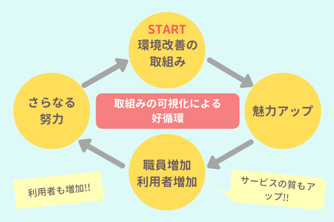 また、職員や利用者の満足度が上がることによって、サービス利用者が増えたり、さらに入職者が増えるといった好循環が生まれるでしょう。