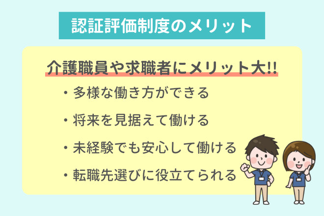 介護の認証評価制度は、働く職員の満足度を向上することに重きを置いています。そのため、この制度の代表的なメリットは介護職員や求職者にあることが特徴です。