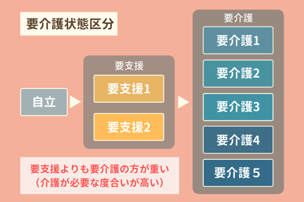 要介護1~要介護5に区分されており、数が大きくなるにしたがって介護度は重くなり、より介護が必要な状態になります。