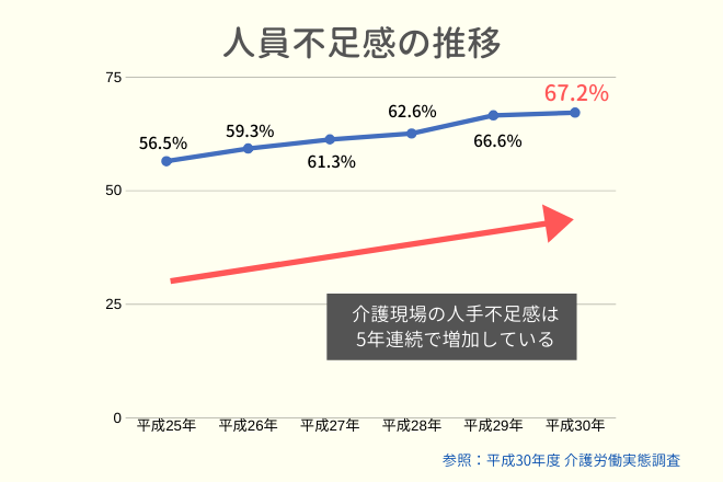 平成30年度 介護労働実態調査の結果では、「介護人員の不足感を感じている」という回答が67.2%。平成25年以降から5年連続増加していると発表されています。