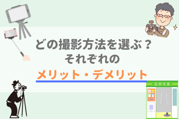証明写真を撮影する方法は、「写真館での撮影」「スピード写真機」「自分で撮影」のいずれかを選ぶ方がほとんどでしょう。印象よくキレイな証明写真を撮るにはどの方法がいいのか迷いますよね。そこで、それぞれのメリットやデメリットをご紹介したいと思います。