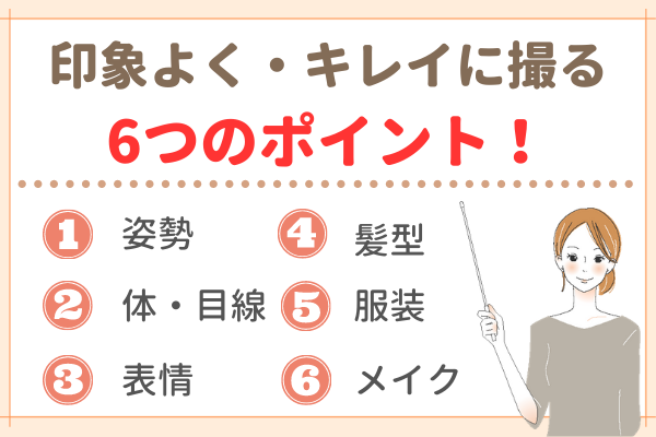 “印象よく・キレイ”に撮るポイントは、次の6つです。さっそく見ていきましょう。