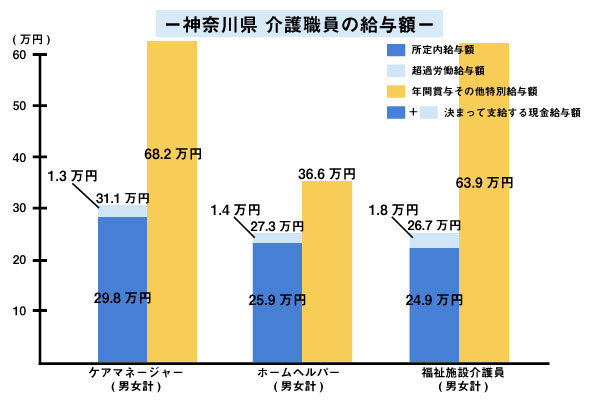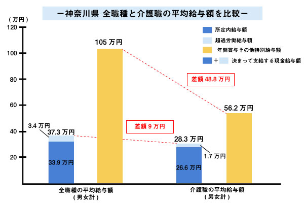 こうして見てみますと、神奈川県の介護職は全職種の平均給与額よりも給与水準が低いというデータが出ていることが分かります。