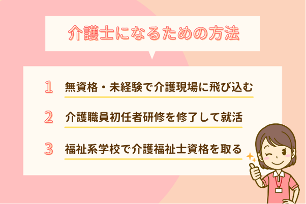 ここからは介護士になるためのステップとして、代表的な3つの方法をご紹介していきますので、自分にはどの方法が合っているかを決める参考にしていただければと思います。