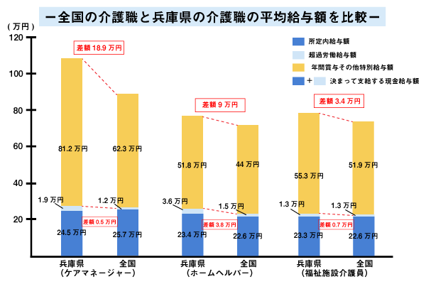 兵庫県の介護職員と全国の介護職の給料を比較してみました。
