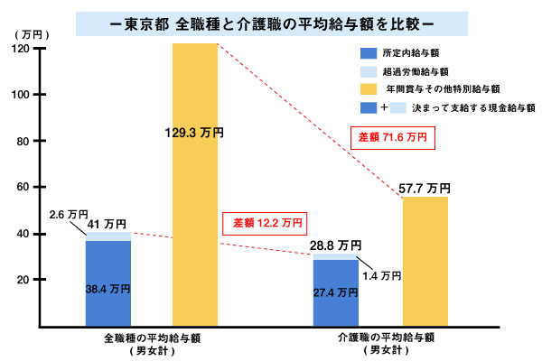 これを年収に換算すると東京都の全職種の年収はおよそ621万円、東京都の介護職の給料はおよそ403万円で218万円の差があることになります。