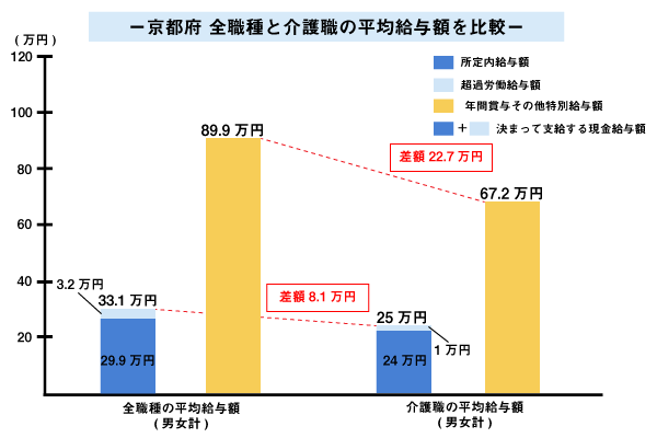 ・京都府の全職種と比較した場合、介護職は月給で4~6万円ほど低くなる