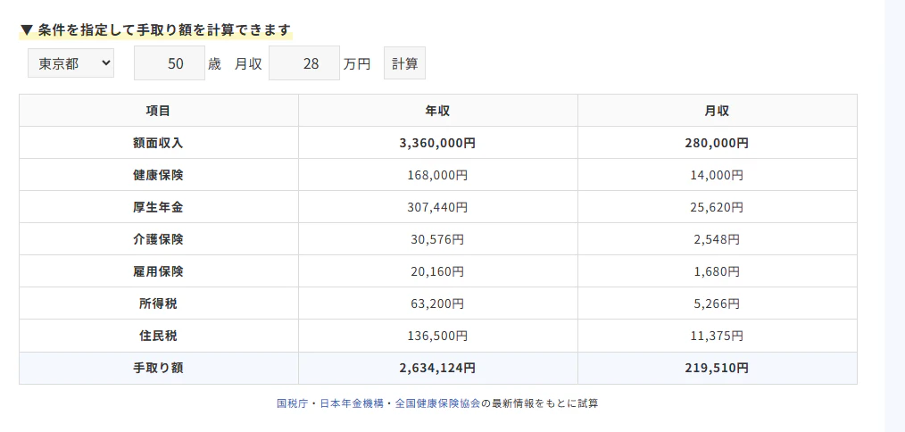 勤務地を仮に東京都とし、年齢を50才、月収を28万円として試算すると手取り額の平均は上記のような結果となります。