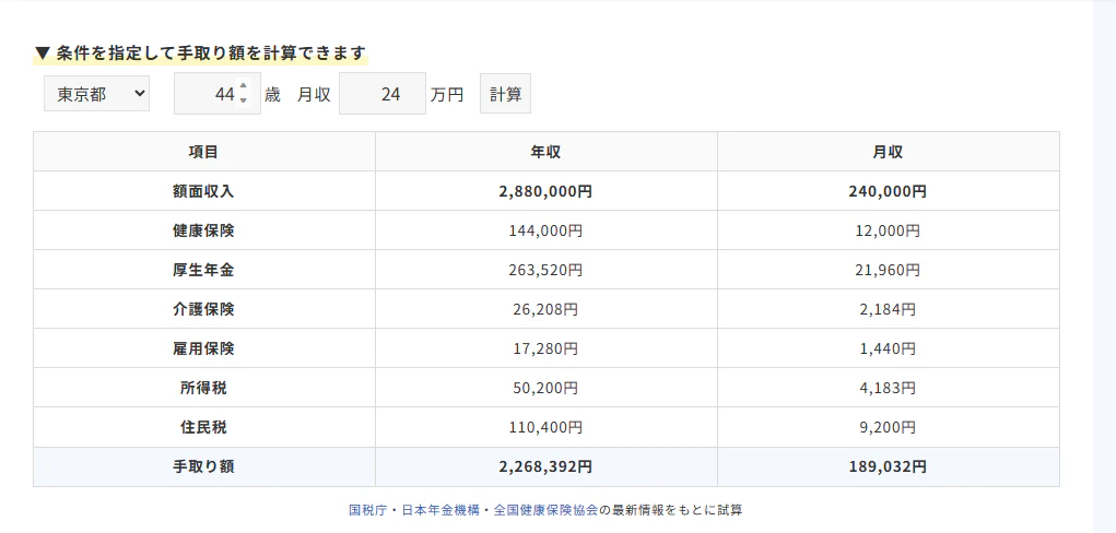 勤務地を仮に東京都とし、年齢を44才、月収を24万円として試算すると手取り額の平均は上記のような結果となります。