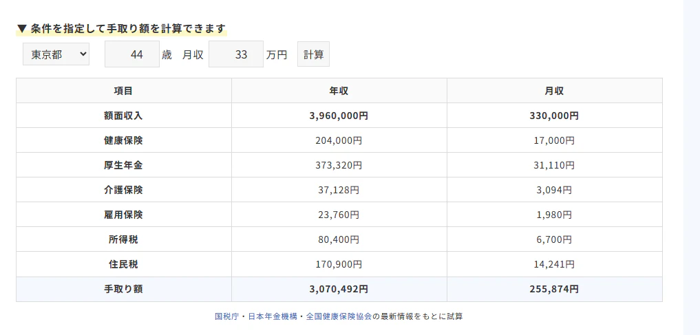 勤務地を仮に東京都とし、年齢を44才、月収を33万円として試算すると手取り額の平均は上記のような結果となります。
