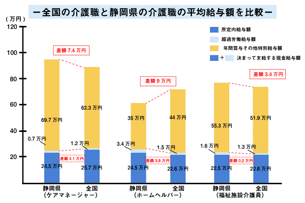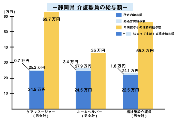 静岡県のケアマネージャーの給料は全国平均よりも1.2万円安く、ホームヘルパーは全国平均よりも2.1万円高いようです。福祉施設介護員は全国の介護職の方が1000円高いとされています。