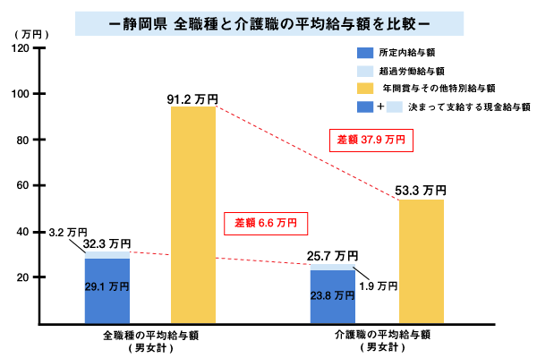 上記に示した図は静岡県の他職種の給料と介護職の給料を比べたものです。