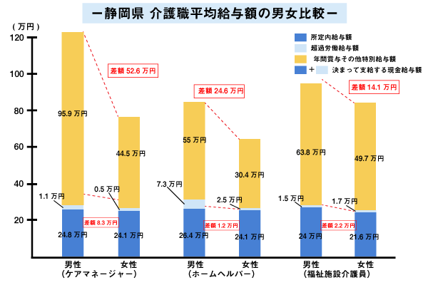 静岡県の介護職員の給料を男女別でみた場合、所定内給与額、年間賞与額ともに、男性のほうが少し高くなる傾向にあります。特に男性のケアマネージャーの給料が高い傾向にありますが、これはケアマネージャーは経験年数が資格取得の条件になっていることから勤続年数が長くなることが考えられます。また勤続年数が長くなると、役職についている割合が高いことが考えられ、他職種でも男性が役職についてることが多いことから男性の給料が高い傾向にあるのではないでしょうか。