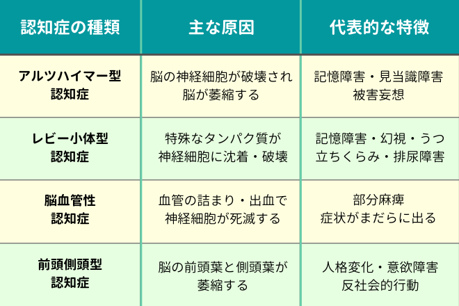 認知症は代表的な4パターンに分類され、それぞれに原因や症状が異なります。