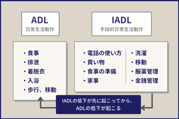 など、生活環境や精神的ストレスによっても、IADLの低下は進行していきます。