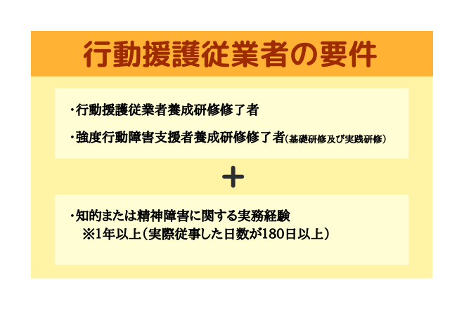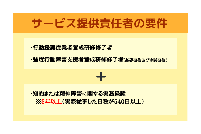 ・2021年3月31日までは経過措置としてて知的または精神障害に関する実務経験が5年以上 (実際従事した日数が900日以上)の介護福祉士 ・実務者研修修了者 ・介護職員基礎研修修了者 ・居宅介護従業者養成研修1級課程修了者 ・居宅介護職員初任者研修課程または居宅 介護従業者養成研修2級課程修了者で、3 年以上介護等の業務に従事した者はサービス提供責任者として従事することが可能