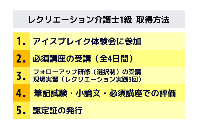 レクリエーション介護士1級を取得するには、レクリエーション介護士2級の資格が必須です。
