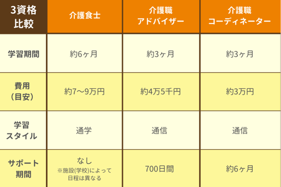 介護食コーディネーターは他の2資格に比べてやさしく学べる講座です。