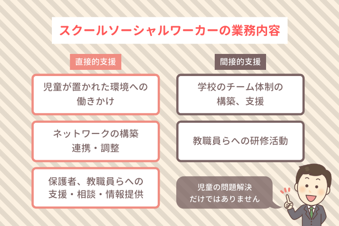 スクールソーシャルワーカーが行う仕事は、直接的支援と間接的支援とに分けられます。