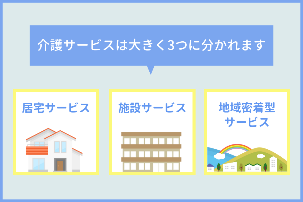 介護保険適用となる介護サービスは非常に多くの種類がありますが、大きくは次の3つに分けられます。