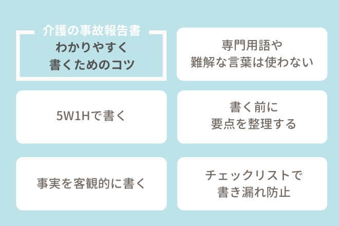 介護事故報告書の書き方と例文のコツは以下の通りです。