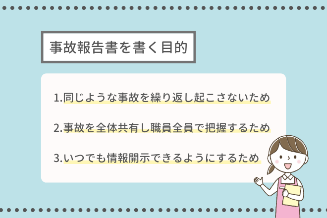 事故報告書の作成は、万が一事故が原因で訴訟になった場合などに、事業所や職員を守るためのものでもあるのです。