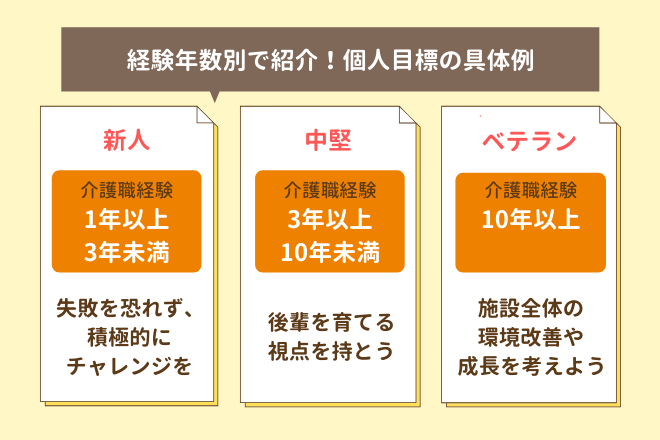 個人目標の内容は、介護職の経験年数や知識・スキルのレベルによって大きく異なります。