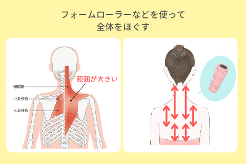 僧帽筋は背中の一番大きな筋肉で、一点のアプローチではなかなかこりはほぐれません。