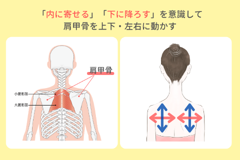 肩甲骨、またその周辺の筋肉を「寄せる」「下げる」を意識して、内外・上下に動かすストレッチを行いましょう。