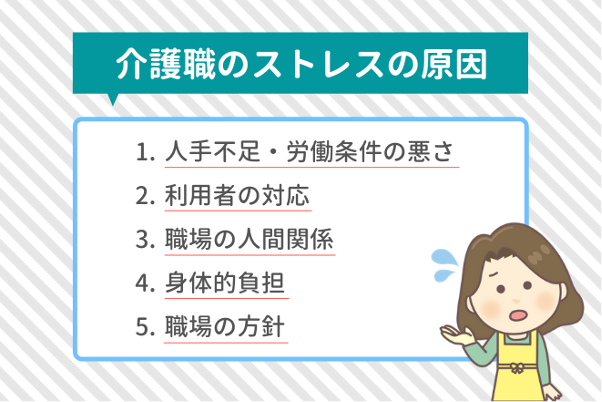 介護職員のストレスを引き起こす代表的な原因は次の5つです。