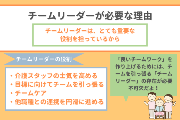良いチームワークを作り上げるためには、チームを引っ張るチームリーダーの存在は欠かせません。なぜなら、介護施設におけるチームリーダーの役割はとても重要だからです。